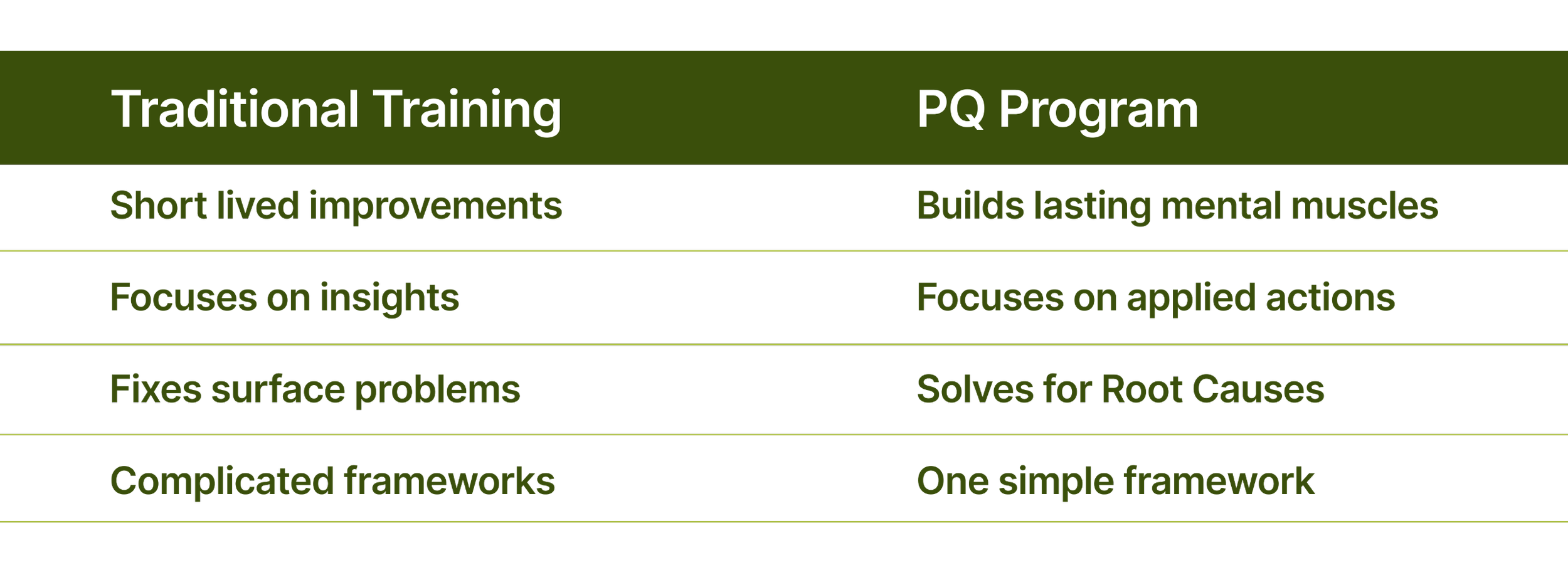 This 7-week boot camp will help you transform negative, limiting thought patterns into positive, regenerative ones, empowering you to become the change leader you aspire to be—for yourself, your team, and your organization. Lasting change toward a more positive mindset requires creating new neural pathways and building habits through consistent daily practice, and that’s exactly what our PQ Program is designed to help you achieve..